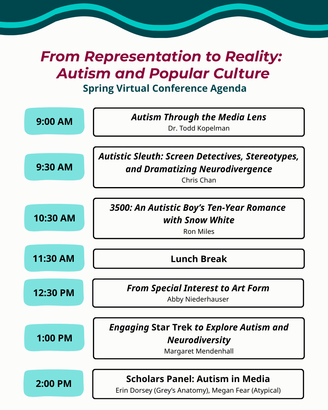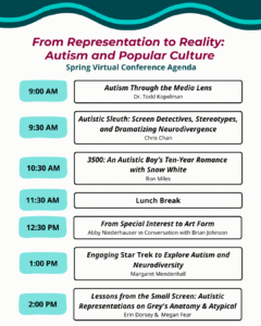 Join us Friday, April 3rd from 9:00am to 3:00pm as we hear from scholars, caretakers, and individuals with Autism discussing the connections, interpretations, and representations of neurodivergence in pop culture.