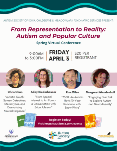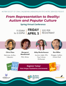 Together with Childserve and Meadowlark Psychiatric Services, Autism Society of Iowa is proud to host “From Representation to Reality: Autism and Popular Culture”, a one day virtual conference.