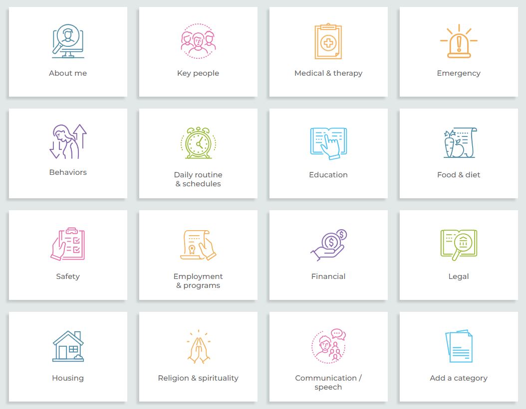 - Customize care sections like: About Me, Key People, Medications & Therapies, Behaviors, Daily Schedules, Communication, Education, and more